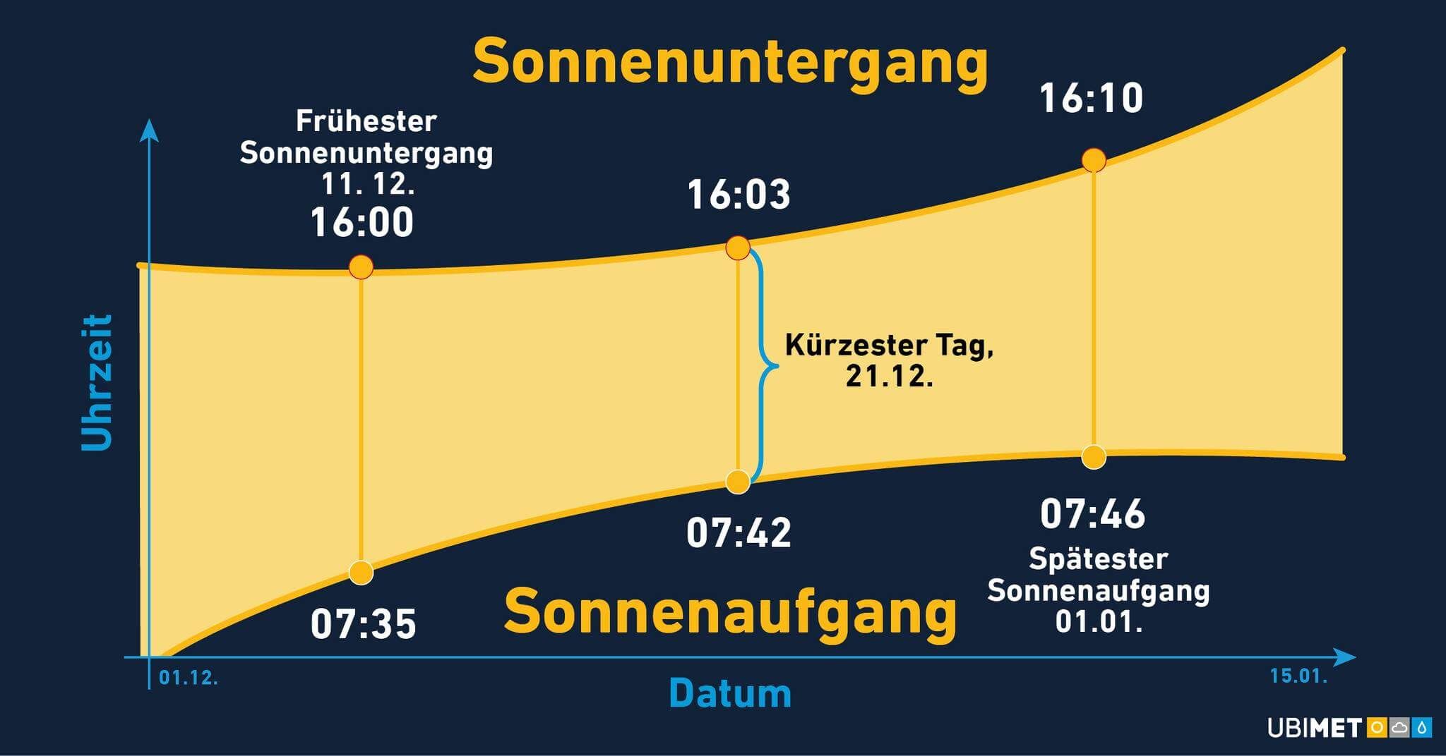 Für Österreich hat dies den kürzesten Tag und die längste Nacht zur Folge. So geht in Wien die Sonne erst um 07:42 auf und um 16:03 bereits wieder unter. Das heißt aber auch, dass ab dem 21. Dezember die Tage wieder länger werden und die Nächte wieder kürzer. Vorerst nur um wenige Sekunden, nach Weihnachten dann um etwa 1 Minute pro Tag und ab dem 10. Jänner um etwa 2 Minuten täglich. In exakt einem Monat sind die Tage dann schon etwa 40 Minuten länger.
