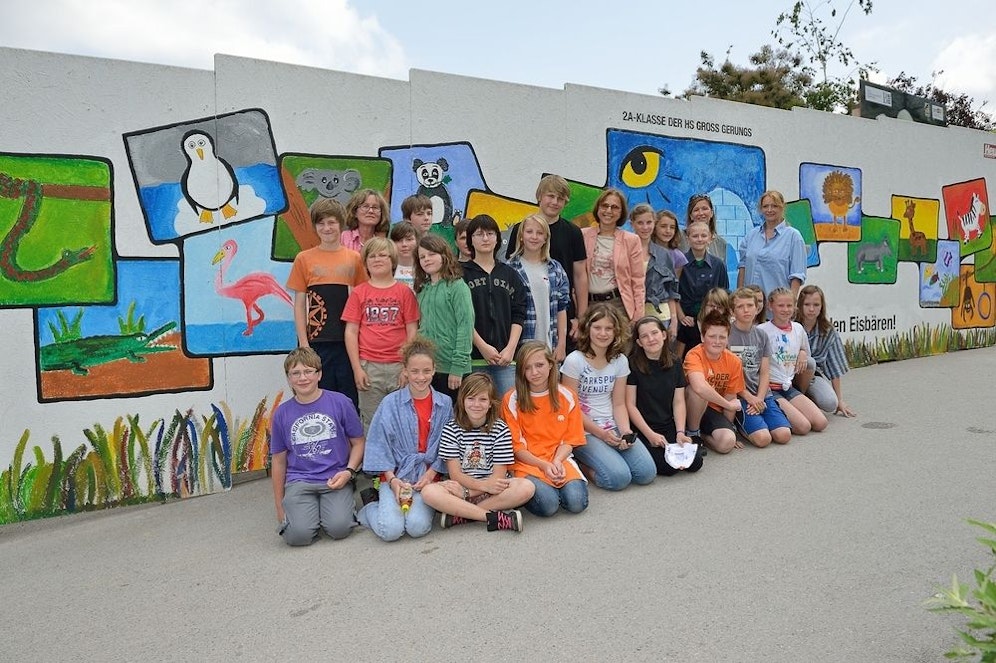 Jetzt nahmen sie Pinsel und Farbe in die Hand und verschönerten die Wand. Schüler, Zeichenlehrerin Sabine Ambros und Tiergarten-Direktorin Dagmar Schratter sind mit dem Ergebnis sichtlich zufrieden!