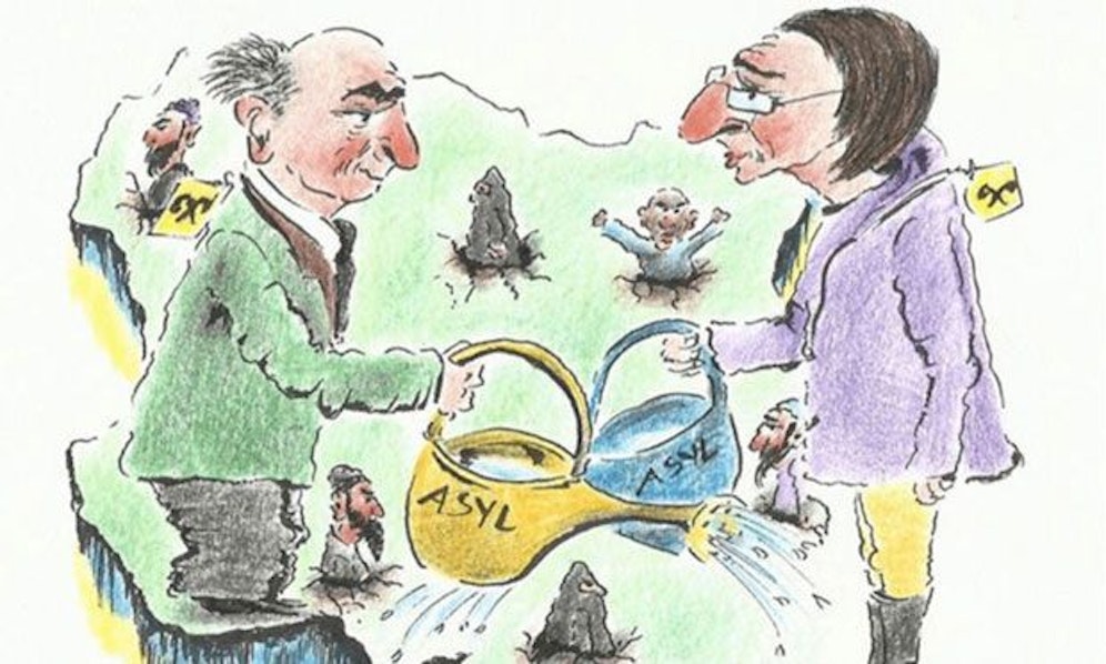 Von Beifall über "Ihr seid Rassisten" reichen die Postings auf der Facebook-Seite von Gottfried Waldhäusl. Auf den Karikaturen sind Landeschef Erwin Pröll und Innenministerin Johanna Mikl-Leitner mit Gießkannen zu sehen und aus dem Boden sprießen Asylwerber (Anm.: Christian Höbart hatte Asylanten ja als Erdmenschen bezeichnet).