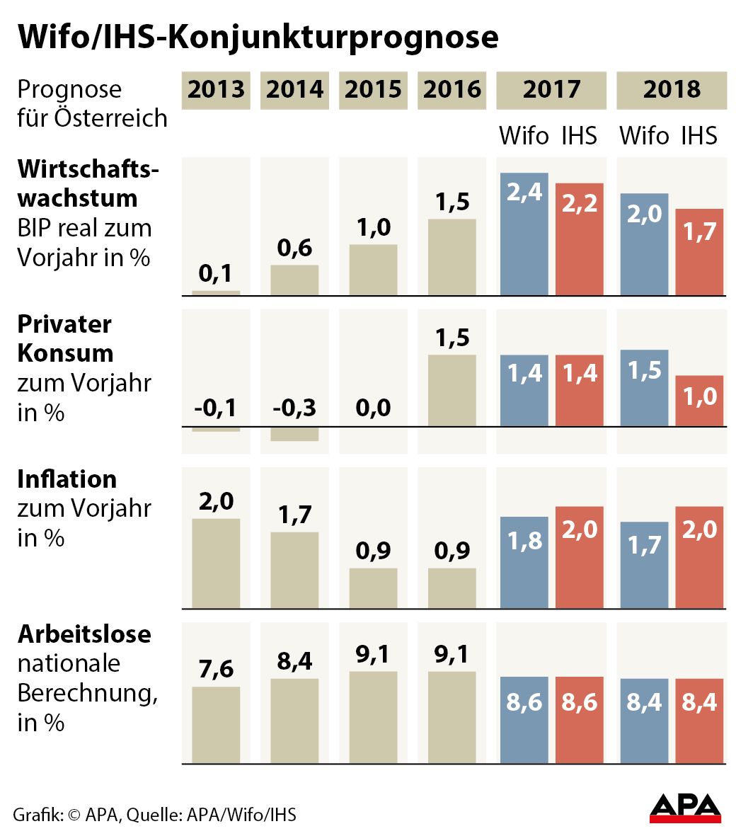 Und neuerlich werden die Prognosen deutlich nach oben korrigiert! Laut Institut für Höhere Studien (IHS) wird die heimische Wirtschaft heuer um 2,2 Prozent wachsen, 2017 sollen es 1,7 Prozent sein. Das Wirtschaftsforschungsinstitut (Wifo) geht sogar von einem Plus von 2,4 Prozent (2017) bzw. 2,0 Prozent (2018) aus.