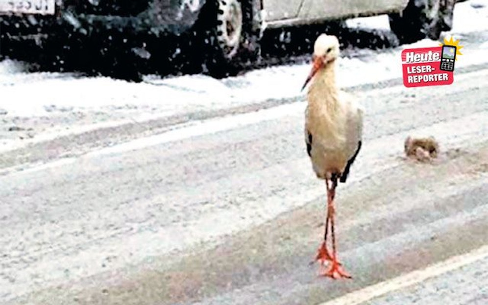 Ein Storch im Schnee? Dieser Meister Adebar scheint sich zu fragen: "Was mach ich hier, ich armes Tier?"