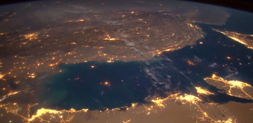 Wie funkelnde Sterne erscheinen die Blitze auf der Erde. Ein Gemälde, das nur die Natur malen kann. Aufgenommen wurden die Aufnahmen von ESA-Astronaut Paolo Nespol, als die ISS vom südlichen Atlantik über Kasachsten flog.