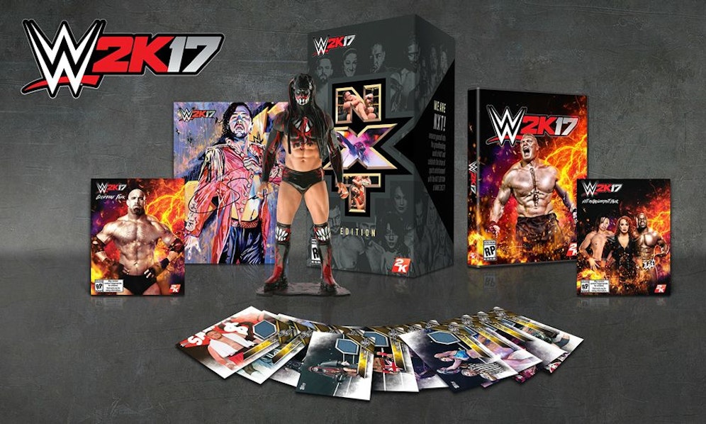 Die NXT Edition enthält ein Exemplar des Videospiels WWE 2K17 mit exklusiver Premium-Packung und NXT-Booster-Pack. Spielbare NXT-Superstars: Shinsuke Nakamura, Nia Jax und Apollo Crews. 50 Prozent mehr Punkte bei NXT in "Meine Karriere". Einen exklusiven Leinwandruck des WWE-Künstlers Rob Schamberger mit der Unterschrift von NXT-Superstar Shinsuke Nakamura. Eine exklusive, 20 Zentimeter große Sammelstatue von "Demon" Finn Bálor. Eine exklusive Topps NXT TakeOver: London Mat Relics-Karte, jede einzelne bestückt mit einem Teil der Ringmatte, die beim Event zum Einsatz kam, und mit einem Bild von einem der 14 Superstars versehen, die beim Event aufgetreten sind. Jede dieser Karten hat eine von 10 verschiedenen Raritätsstufen. Das Goldberg-Pack mit zwei spielbaren Versionen des legendären WCW- und WWE-Superstars Bill Goldberg sowie zwei spielbaren Arenen: WCW Monday Nitro und Halloween Havoc. Und: Ein Suplex City-Shirt.