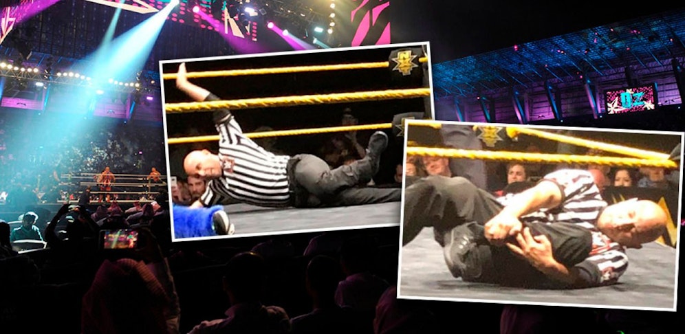 Nicht nur die WWE-Superstars sind ständigem Verletzungsrisiko ausgesetzt, auch die Referees leben gefährlich. Bei einem NXT Live-Event brach sich Schiedsrichter Tom Castor den Fuß, beendete das Match aber trotzdem selbst.