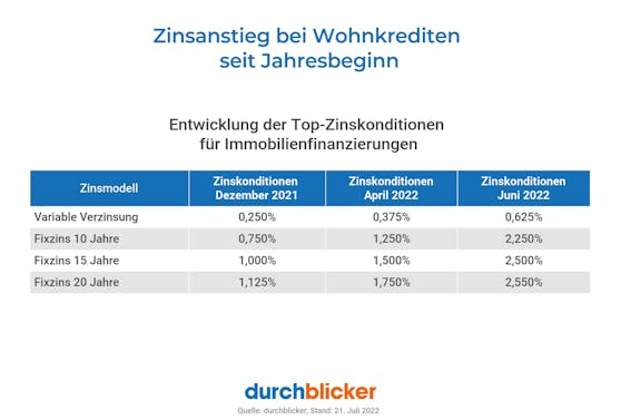 Die österreichischen Banken haben das historische Ende der europäischen Null-Zinspolitik bei Krediten bereits vorweggenommen. Schon seit einem Jahr sind die Zinsen in Österreich leicht gestiegen. Mit der aktuellen Rekordinflation hat sich auch die Verteuerung der Kredite noch einmal deutlich beschleunigt, zeigt eine aktuelle Erhebung von Österreichs größtem Tarifvergleichsportal durchblicker. Laut durchblicker-Daten haben sich die Fixzinsen in Österreich seit Jahresbeginn verdoppelt bis fast verdreifacht. Je nach Bank und Bonität zahlen Kund:innen für einen Fixzinskredit mit einer Laufzeit von 10 Jahren statt 0,750 Prozent im Vorjahr nun im Juli aktuell 2,25 bis 3,50 Prozent Zinsen, bei 15 Jahren 2,50 bis 3,625 Prozent und bei 20 Jahren 2,55 bis 3,75 Prozent. Mehr Zinsen gibt es mittlerweile auch wieder für Sparer:innen. Erst im April haben erste größere Banken die Fixverzinsung für Festgeld erstmals seit langem wieder auf über ein Prozent p.a. erhöht.
