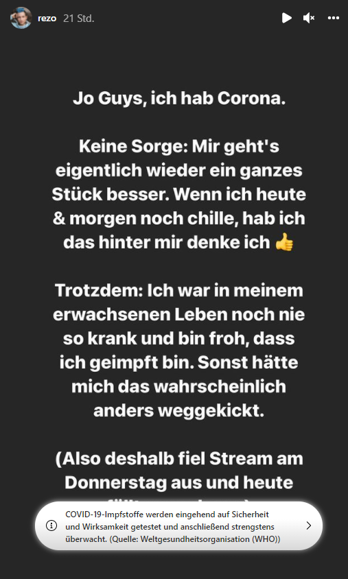 In seiner Instagram-Story erklärt der 29-Jährige, dass er sich mit dem dem Coronavirus infiziert hat. "Ich war in meinem erwachsenen Leben noch nie so krank und bin froh, dass ich geimpft bin", meint Rezo und weiter: "Sonst hätte mich das wahrscheinlich anders weggekickt."