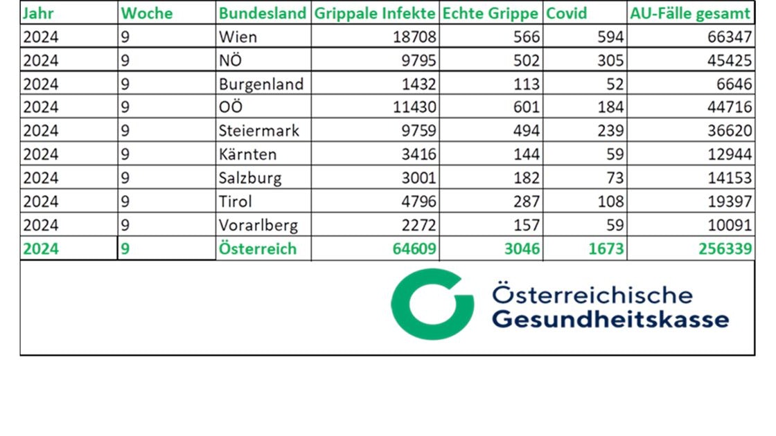 Das ist auch deutlich in der Erhebung der Österreichischen Gesundheitskasse (ÖGK) abzulesen. Nach 4.754 Krankenstandsmeldungen aufgrund der echten Grippe ist diese Zahl vergangene Woche auf 3.046 gesunken. Immer noch mit Abstand am stärksten betroffen sind hier Oberösterreich (601), Wien (566), Niederösterreich (502) und die Steiermark (494).
