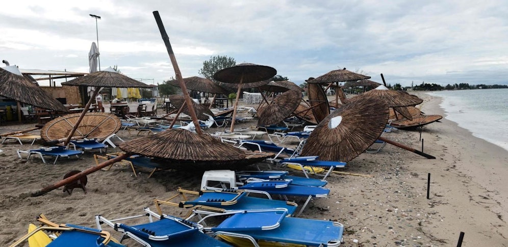 Ein Mann aus Tschechien starb in seinem Wohnmobil, das von Sturmböen erfasst wurde und sich mehrfach überschlug. Seine Frau erlag ihren Verletzungen in einem Gesundheitszentrum, wie ERT unter Verweis auf den Zivilschutz berichtete. Auch der 18-jährige Sohn des Ehepaars befand sich im Wohnmobil. Er überlebte das Unglück verletzt.