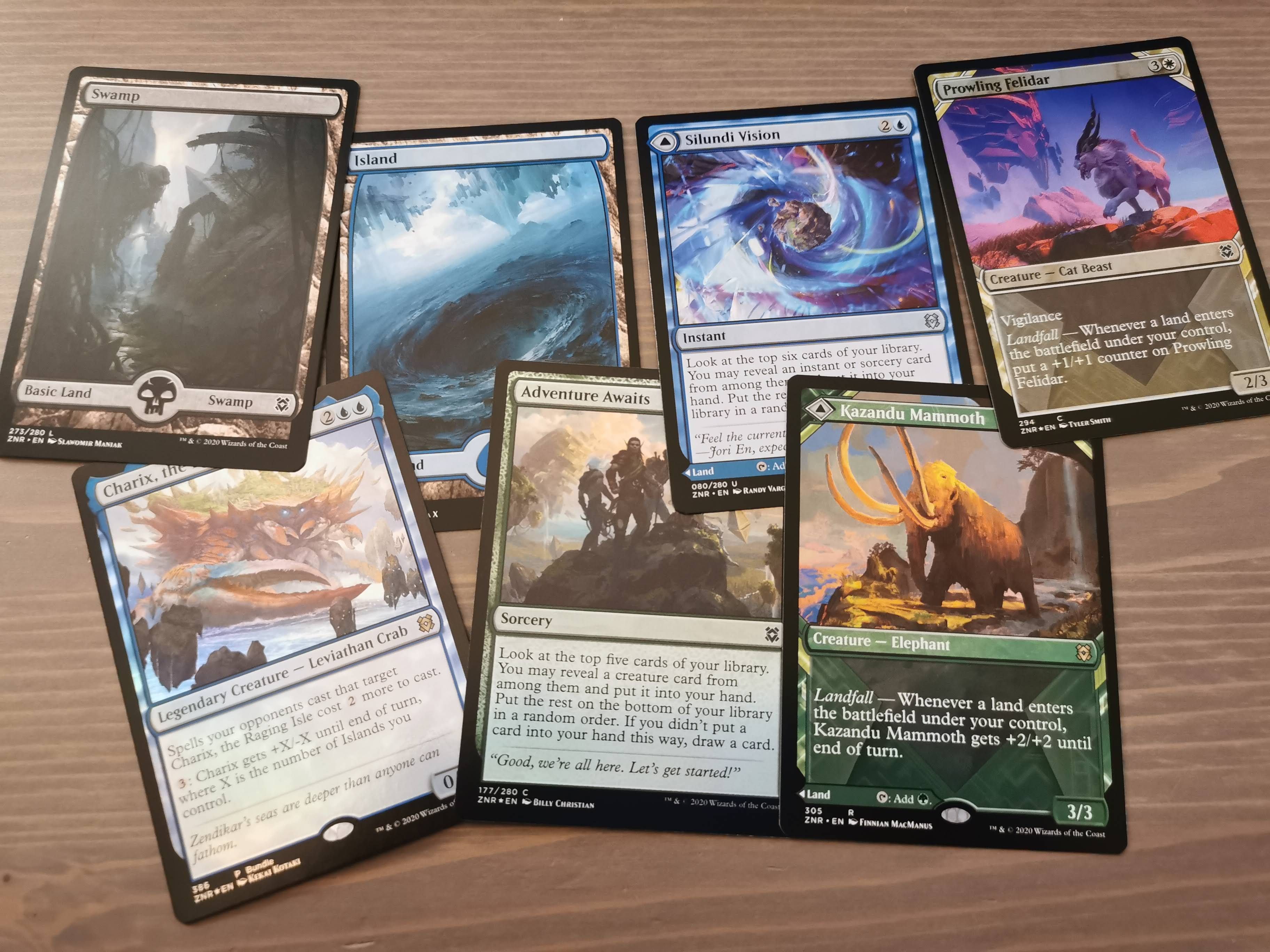 Das Öffnen der Boosterpacks ist ein essenzieller Teil der "Magic"-Erfahrung – und das funktioniert auch mit dem "Zendikar Rising Gift Bundle" wunderbar. Jedes der zehn kleinen Päckchen enthält eine seltene oder mythische Karte, drei uncommon, neun common und ein Land mit besonders großem Artwork. Entweder alle zusammen oder über mehrere Tage zu öffnen, hält die Spannung aufrecht.