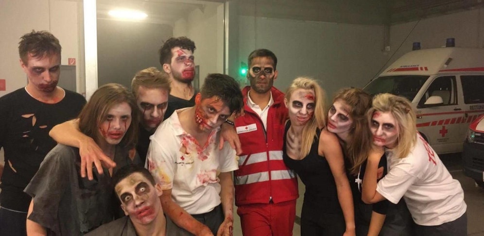 "Das gruselige Make-Up haben Kollegen von der realistischen Notfalldarstellung gemacht, die normalerweise bei unseren Übungen Verletzungen möglichst echt nachstellen", verrät Schodritz, der selbst mit zwei Kollegen am Drehbuch geschrieben den Horror-Film selbst gedreht hat.