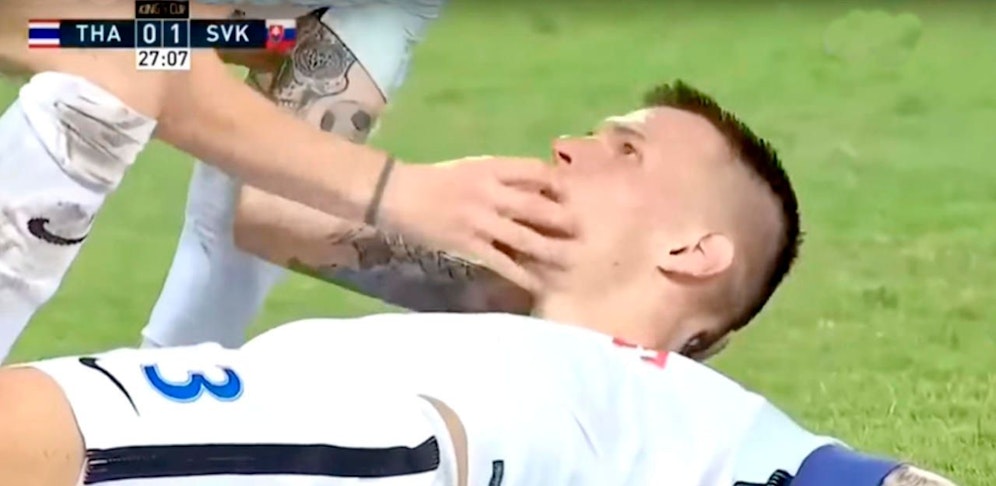 Horror-Szenen spielen sich beim Test Slowakei gegen Thailand ab. Martin Skrtel geht k.o. und verschluckt seine Zunge. Ein Teamkollege hilft zum Glück sofort.