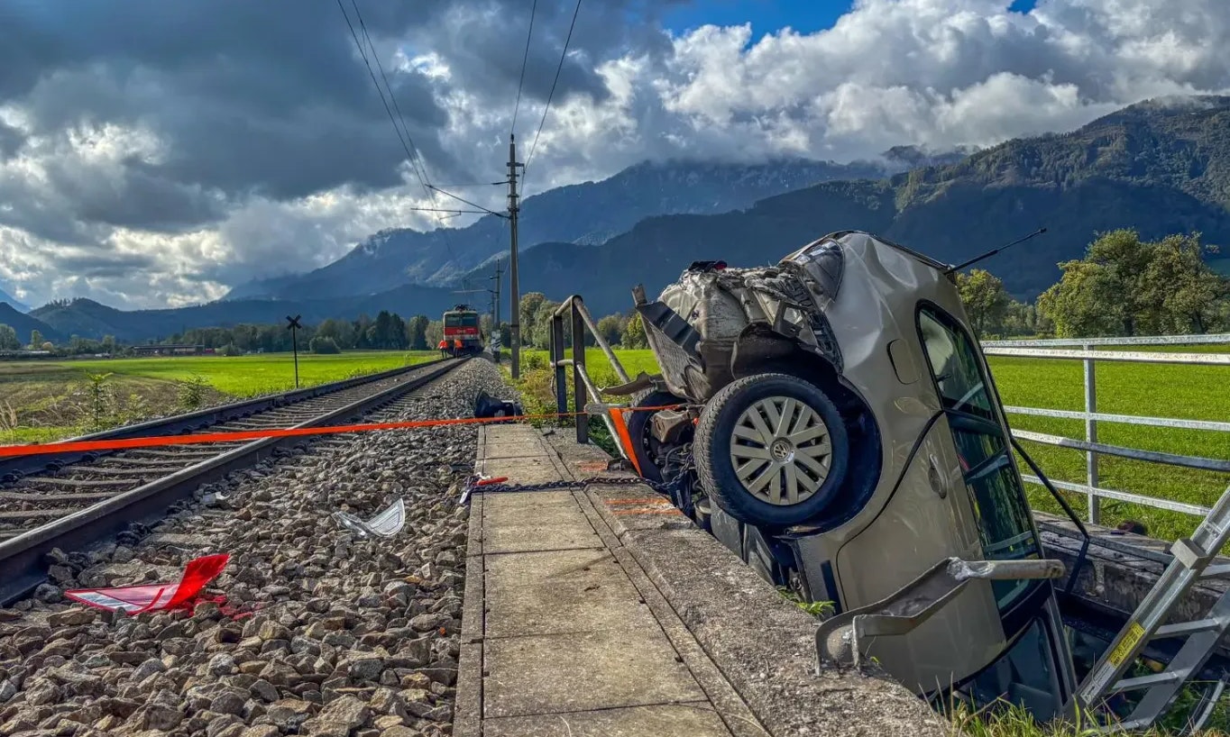 Zug schleudert Auto weg, Lenker in Wrack eingeklemmt