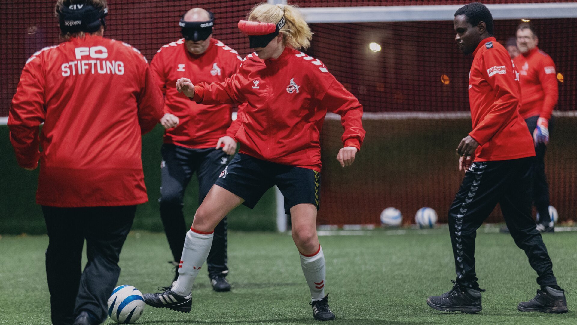 Suse Stedtfeld spielt im deutschen Blindenfußballteam der Frauen und trainiert jede Woche bei der FC-Stiftung in Köln mit anderen blinden und sehbehinderten Spielerinnen und Spielern.