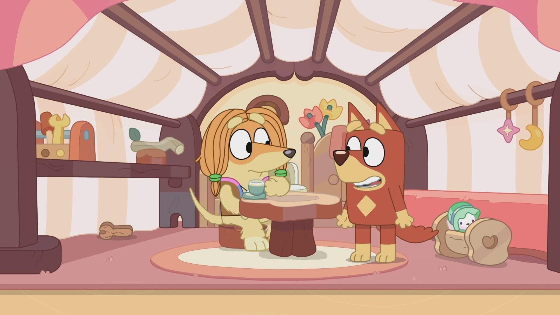 Indy und Rusty spielen Mutter-Vater-Kind und können sich nicht darauf einigen, wer von ihnen zur Arbeit geht, also hören sie auf, miteinander zu spielen. Indy hat Schwierigkeiten, einen Babysitter zu finden, und Bluey macht Rusty zu ihrem Baby!