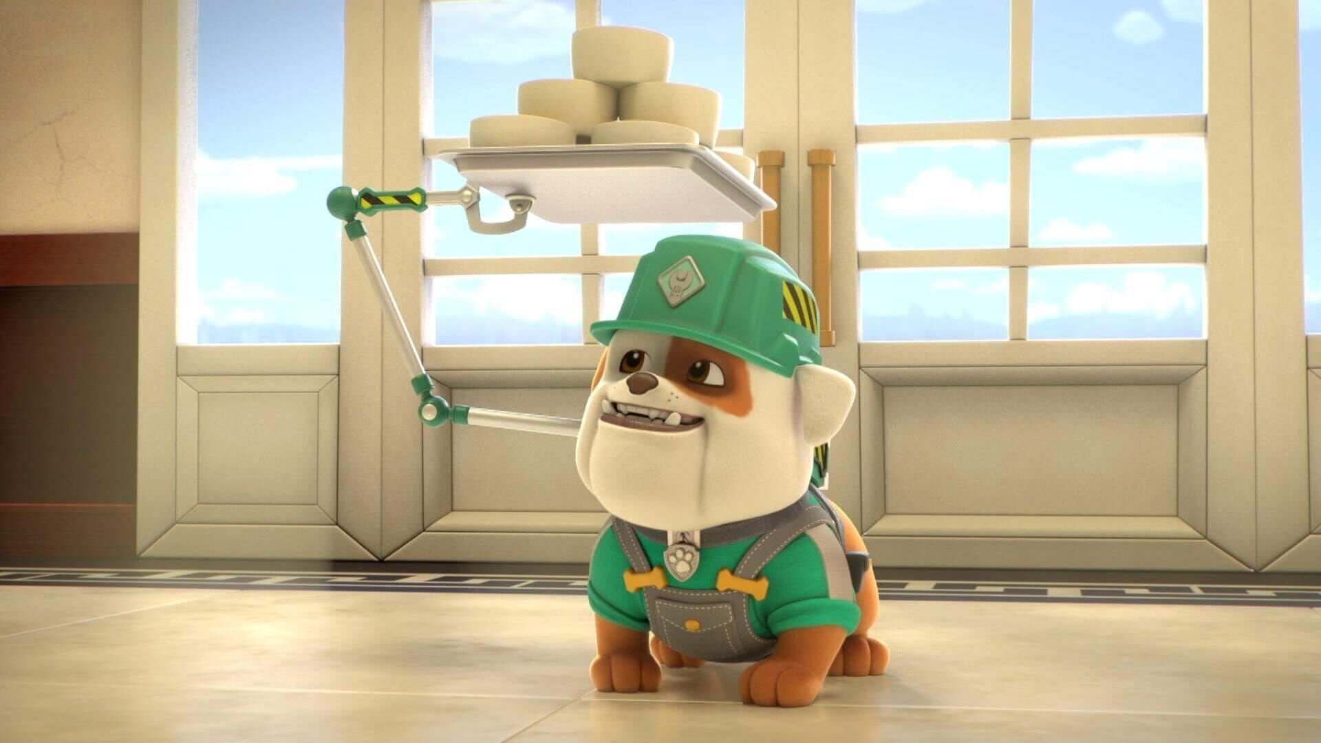 Die Hunde und viele Bewohner:innen von Baubucht sind an der Strand-Promenade zum Karussellfahren. Es sollte ein sonniger und warmer Tag werden, aber plötzlich fängt es heftig an zu schneien. Es ist bitterkalt geworden, und niemand kann durch den hohen Schnee nach Hause fahren. Alle müssen im Hotel von Zoes Cousin Henri Harmonie, gleich um die Ecke, übernachten. Aber Henri ist auf so viele Gäst(e):innen nicht vorbereitet. Die Hunde versprechen, ihm zu helfen. Doch das viele Treppensteigen ermüdet die fleißigen Helfer schneller als gedacht. Die bautastische Lösung ist eine Rutsche, auf der sie wenigstens wieder nach unten rutschen können. Rauf wird gelaufen, nach unten wird gerutscht. Zum Abendessen gibt es Opa Gravels heiße, herzhafte Suppe, auf die sich die Gäst(e):innen schon den ganzen Tag freuen. Aber als die Hunde oben ankommen, sind die Schüsseln leer, sie haben die leckere Suppe beim Treppensteigen verschüttet. Und auch dafür gibt es eine Lösung. Ein Raketen-Aufzug wird gebaut, der die Hunde sanft nach oben transportiert, so dass alle Gäst(e):innen eine schöne heiße Suppe genießen können.