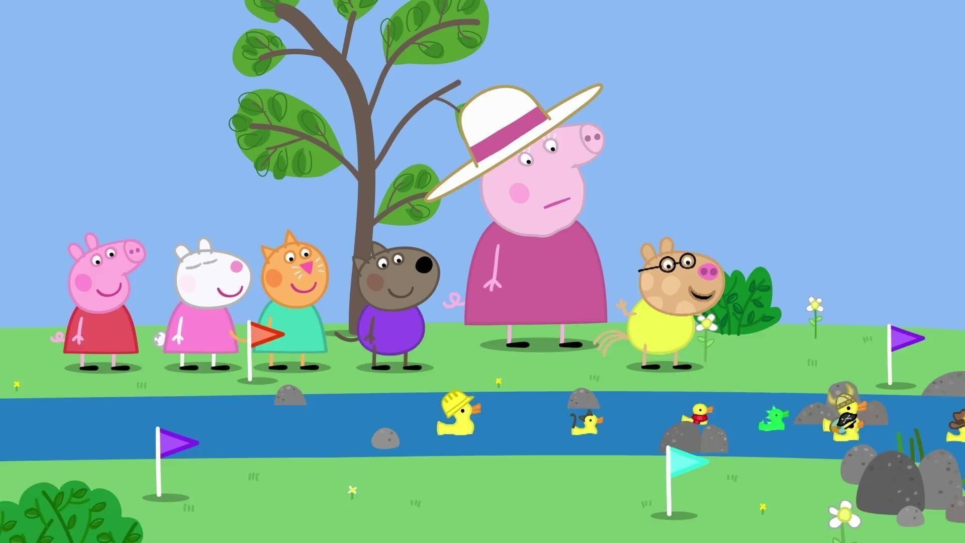 Familie Wutz und andere Familien veranstalten ein Gummientchen-Wettschwimmen. Peppa startet mit einem Entchen, das sie sich von Evie ausgeliehen hat. Frau Mümmel erklärt die Regeln und disqualifiziert Opa Wutz, Opa Kläff und Opi Mümmel, die ihre Enten mit unfairen Antrieben ausgestattet haben. Dann geht es los. Frau Mümmel ist die Schiedsrichterin. Die Entchen von Klausi Kläff, Molly Mieze, Pedro Pony, Luzie Locke, Peppa und Schorsch liefern sich ein spannendes Wettschwimmen. Bald liegt Peppas Ente vorne, doch dann sieht es so aus, als käme sie nicht mehr vom Fleck. Bis Frau Ente eingreift und ihr zum Sieg verhilft. Am Ende versammeln sich alle zu einem fröhlichen Picknick. Auch Frau Ente.