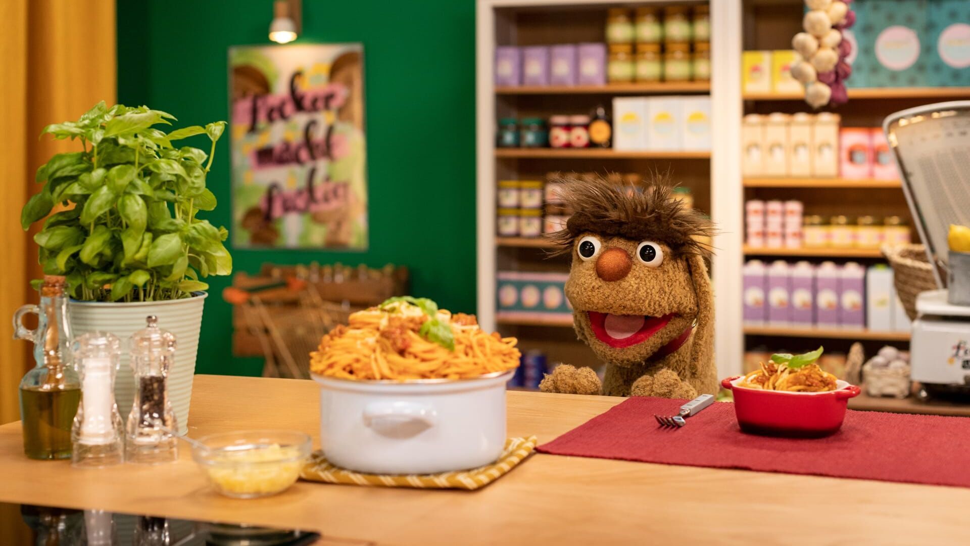 Spaghetti Polonaise: Bolognese kennt Moppi natürlich. Das ist doch dieser Reihentanz! Nicht ganz, weiß Maya, und zeigt ihrem Lieblingshund, was in das Spaghetti-Gericht gehört. Neben Möhren, Sellerie und Tomaten, kommt auch Tofu in die Bolognese. Woraus dieser Tofu besteht und dass man zu zweit schon wunderbar Polonaise tanzen kann, das findet Moppi in "Spaghetti Polonaise" heraus.